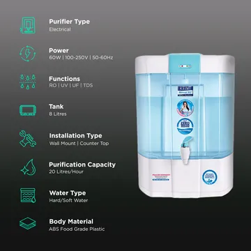 - Purification Process: RO, UV, UF, TDS